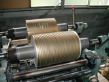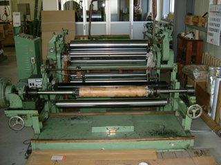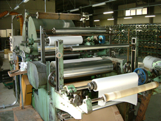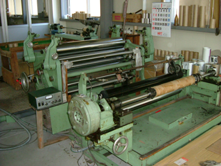| 左が水引の材料(テトロンフイルム)をカットして巻き取る機械、右が和紙をカットして巻き取る機械です。 | |